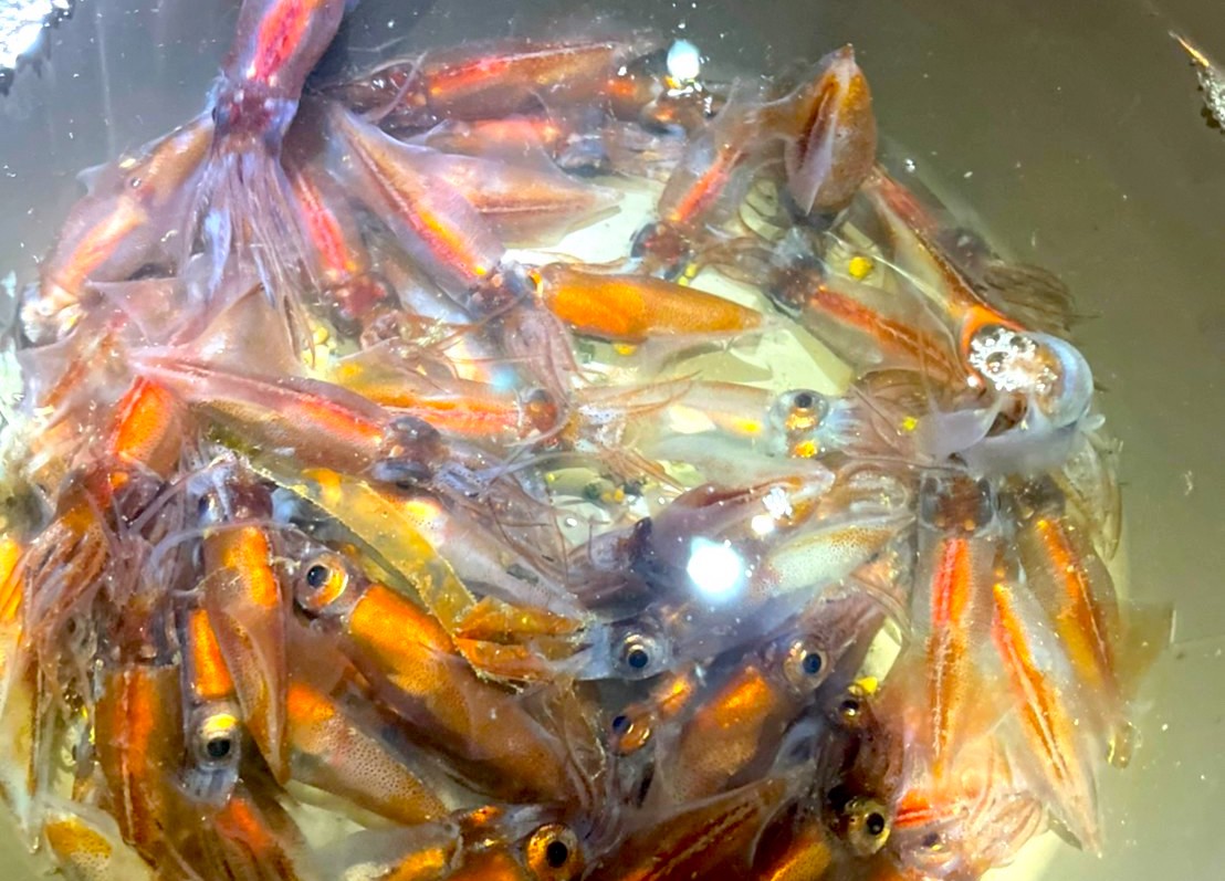 数が多くなると水が汚れてくるので、ホタルイカだけ網に出して水を入れ替えると清潔ですね。