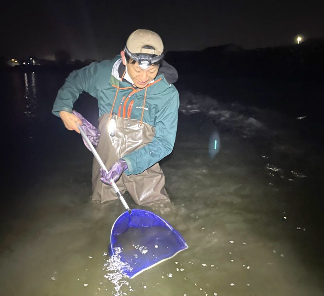 獲れる場所には砂浜と漁港があり、砂浜だと海に入って網ですくい、漁港だと堤防から長い網ですくいます。