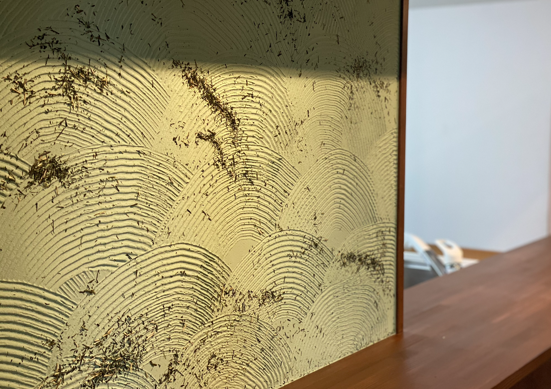 【写真】キッチンカウンターの壁面はお茶の老舗「藤岡園」をイメージした深緑の珪藻土に茶葉を吹きつけたデザインが斬新だ