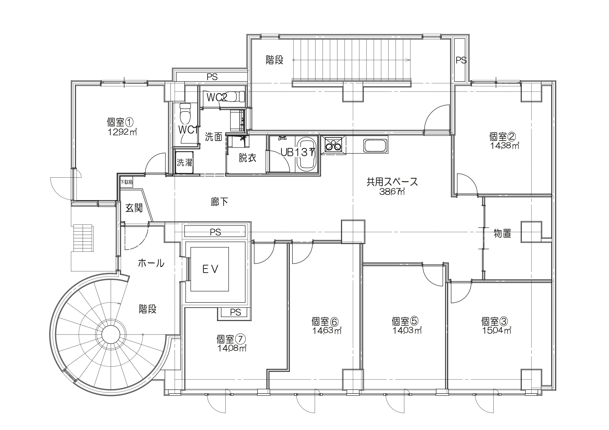 | ①号室 | 入居中 | 女性専用 | 12.92㎡ | ||