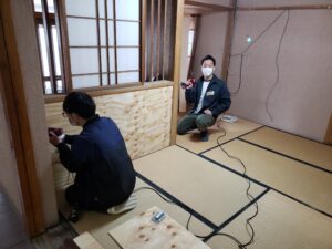 フローリング貼り続きと、コワーキングスペースのデスクづくりを行いました。